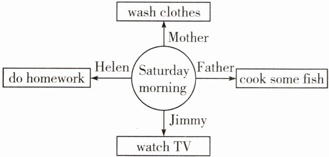 1. 今天是周六,海伦一家都在家里忙碌着。他们在忙什么呢?请根据下面的思维导图,描述一下他们都在做什么。