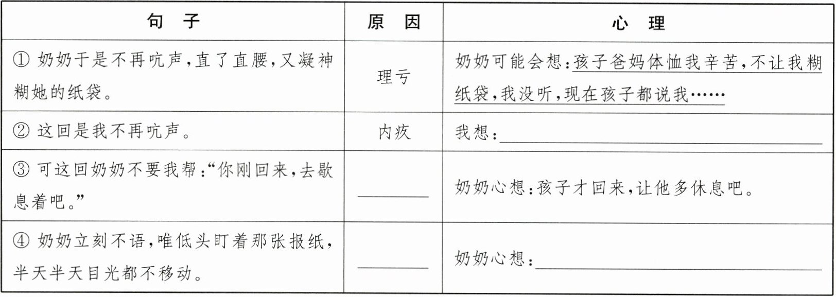 |① 奶奶于是不再吭声,直了直腰,又凝神糊她的纸袋。|理亏|奶奶可能会想:孩子爸妈体恤我辛苦,不让我糊纸袋,我没听,现在孩子都这么说我……|