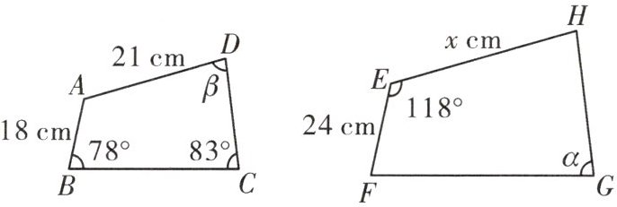 1. 如图,四边形 $ABCD \backsim$ 四边形 $EFGH$,求 $\angle \alpha$