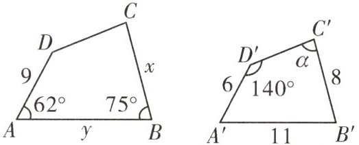 解:$\because$ 四边形 $ABCD \backsim$ 四边形 $A'B'C'D'$,$\therefore \frac{x}{8} = \frac{y}{11} = \frac{9}{6}$,$\angle C = \alpha$,$\angle D = \angle D' = 140^{\circ}$,$\therefore x = 12$,$y = \frac{33}{2}$,$\alpha = \angle C = 360^{\circ} - \angle A - \angle B - \angle D = 360^{\circ} - 62^{\circ} - 75^{\circ} - 140^{\circ} = 83^{\circ}$。