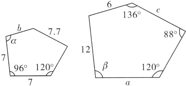 8. 如图,图中的这两个五边形相似,根据图中标注数据求 $a$,$b$,$c$ 的值以及 $\angle \alpha$ 和 $\angle \beta$ 的度数。