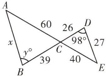 A. 如图,判断两个三角形是否相似,并求出x和y。