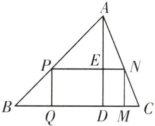 3. 如图,在△ABC中,AD是高,矩形PQMN的顶点P,N分别在AB,AC上,QM在BC上,AD交PN于点E。设BC=48,AD=16,PQ:PN=5:9,求矩形PQMN的面积。