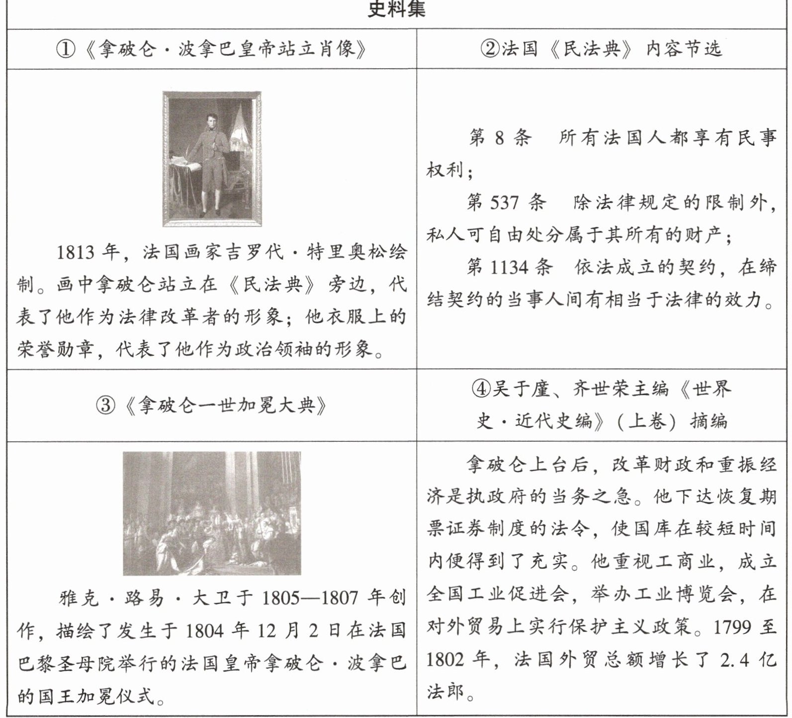 (3)结论:拿破仑虽然当上了皇帝,但他执政的措施有利于维护法国大革命的成果。(言之有理即可,4分)