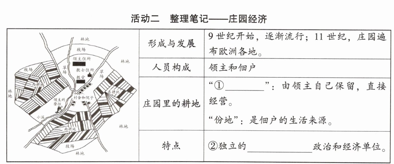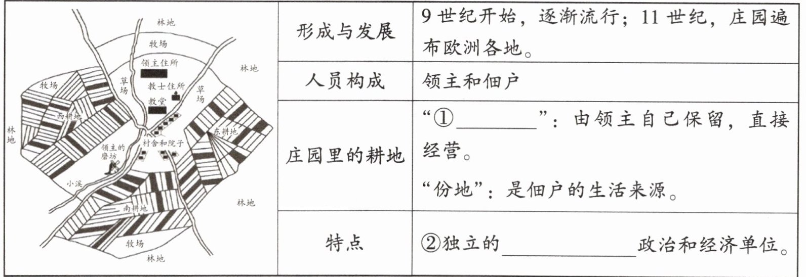 (2)请你根据庄园图解和所学知识,完成以上①②处庄园经济的笔记。(2分)