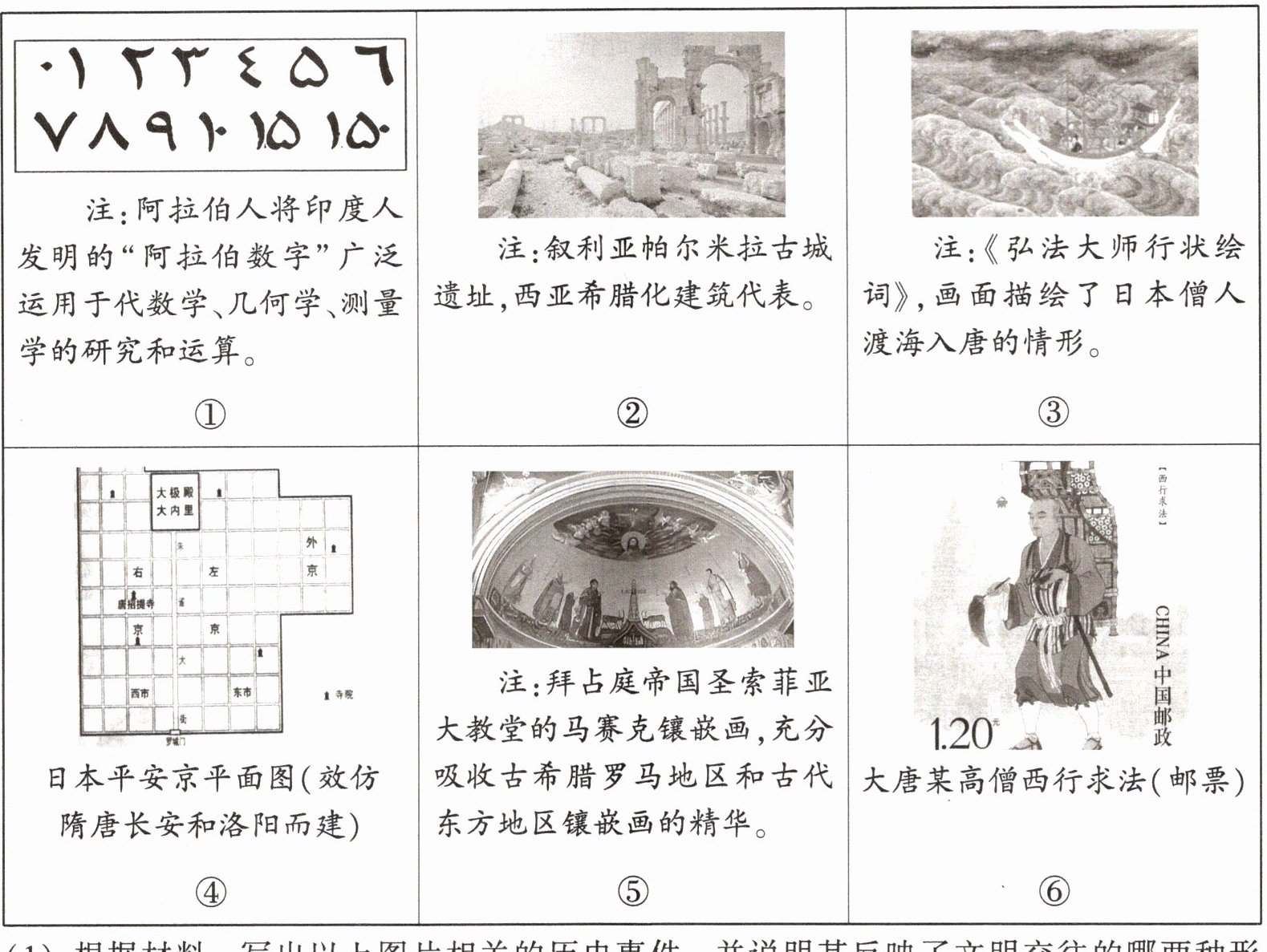 (1)事件:①阿拉伯帝国的扩张或阿拉伯人的文化贡献;②亚历山大东征;③日本遣唐使;④大化改新;⑤拜占庭帝国的地位;⑥玄奘西行。(1 个 1 分,共 6 分)