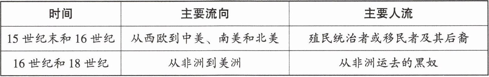 材料二 15 世纪末—18 世纪世界人口移动简表。