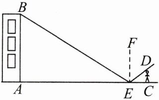 3. 例 如图,小强在地面E处放一面镜子,当他垂直于地面AC站立于点C处时,刚好能从镜子中看到教学楼的顶端B,法线$FE⊥AC$,根据光的反射定律有$∠FEB=∠FED$,此时$EA=20m$,$CE=2.5m$.已知小强眼睛距离地面的高度$DC=1.6m$,请计算出教学楼的高度为