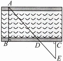1. 例 如图,为了估计河的宽度,我们可以在河对岸选定一个目标点A,在近岸取点B,使AB与河岸垂直,在近岸取点C,E,使$BC⊥AB$,$CE⊥BC$,AE与BC相交于点D,已测得$BD=40m$,$DC=20m$,$EC=24m$,求河宽AB.