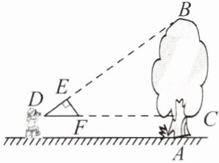 8. 如图,小明同学用自制的直角三角形纸板DEF测量树的高度AB,他调整自己的位置,设法使斜边DF保持水平,并且边DE与点B在同一直线上.已知纸板的两条边$DF=0.5m$,$EF=0.3m$,测得边DF离地面的高度$AC=1m$,$CD=20m$,求树高AB.