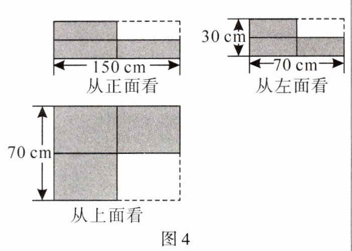 【实践应用】(3)春节将至,小张在网上定制了若干个大小相同的长方体礼盒,商家准备将所有礼盒打包成一个包裹寄走. 如图 4 是从三个方向看到的小张定制的礼盒的三个视图(阴影),请帮忙计算打包用的包装纸最少需要多少平方米.(接头处忽略不计)
