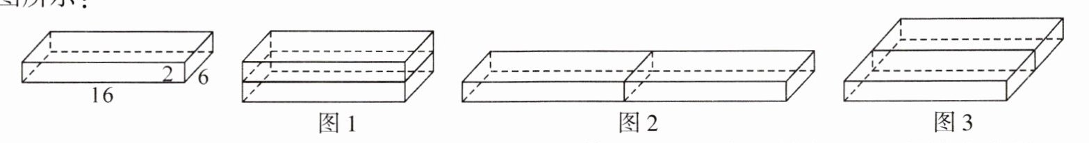 【提出问题】有两个相同的长方体纸盒,它们的长、宽、高分别是 16 cm,6 cm,2 cm. 现要用这两个纸盒搭成一个大长方体,怎样搭可使长方体的表面积最小?