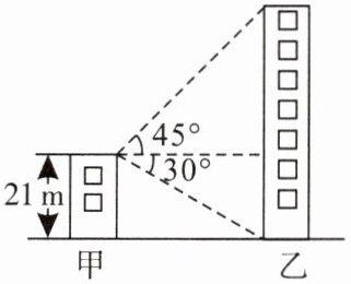 6. 如图,甲楼高21m,由甲楼顶看乙楼顶的仰角是45°,看乙楼底的俯角是30°,则乙楼高度约为