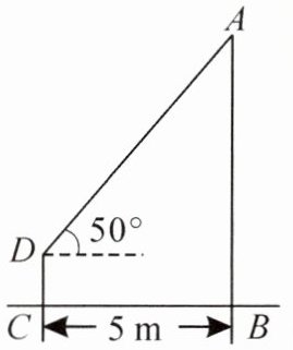 4. 如图,测角仪CD竖直放在距建筑物AB底部5m的位置,在点D处测得建筑物顶点A的仰角为50°.若测角仪的高度是1.1m,则建筑物AB的高度约为