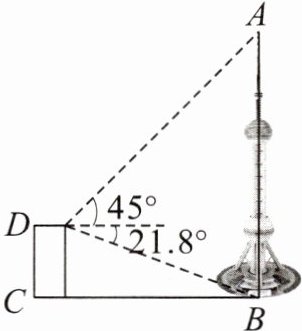 9. (2024·禅城区三模)如图,为测量佛山电视塔的高度,某兴趣小组在电视塔附近一建筑物楼顶D处测得塔尖处的仰角为45°,塔底B处的俯角为21.8°,若建筑物的高CD为68m,求电视塔AB的高度.(结果精确到1m,sin21.8°≈0.37,cos21.8°≈0.93,tan21.8°≈0.40)