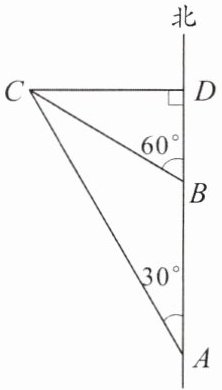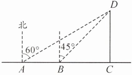5. 如图,某船由西向东航行,在点A测得小岛D在北偏东60°方向上,船航行了10海里后到达点B,这时测得小岛D在北偏东45°方向上,船继续航行到点C时,测得小岛D恰好在船的正北方,求此时船到小岛的距离.