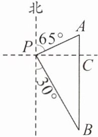 2. 如图,轮船从位于灯塔P的北偏东65°方向上距离灯塔100海里的A处,沿正南方向航行到B处,此时,B处位于灯塔南偏东30°方向上,求BP的长.(结果精确到1海里,参考数据:$\sin 65^{\circ} \approx 0.90$,$\cos 65^{\circ} \approx 0.42$)