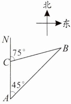 4. (BS 九下 P21 改编)如图,一艘货轮以 36 海里/时的速度在海面上航行,当它行驶到$A$处时,发现它的东北方向有一灯塔$B$.货轮继续向北航行 40 min 后到达$C$处,发现灯塔$B$在它北偏东$75^{\circ}$方向上,则此时货轮与灯塔$B$的距离为____