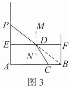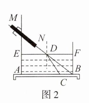 3. (2024·东莞校级模拟)我们在物理学科中学过:光线从空气射入水中会发生折射现象(如图1),我们把$n=\frac {\sin \alpha }{\sin \beta }$称为折射率(其中$\alpha$代表入射角,$\beta$代表折射角).为了观察光线的折射现象,设计了如图2所示的实验,利用激光笔$MN$发射一束红光,容器中不装水时,光斑恰好落在$B$处,加水至$EF$处,光斑左移至$C$处,图3是实验的示意图,其中四边形$ABFE$为矩形,$MN$为法线.
