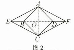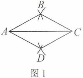 如图 1,分别以点 A,C 为圆心,以大于 $\frac{1}{2}AC$ 的长为半径作弧,两条弧分别相交于点 B,D,依次连接 A,B,C,D,四边形 ABCD 看上去是菱形。