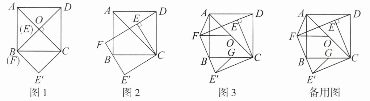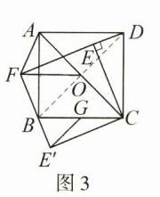 (2)奋发小组受博学小组的启发,进一步深入探究,如图3,取$BC$的中点$G$,连接$E'G$,$FO$,$AF$,又发现:在点$E$运动过程中,$FO$与$E'G$始终保持特定的数量关系,请写出此数量关系,并说明理由;