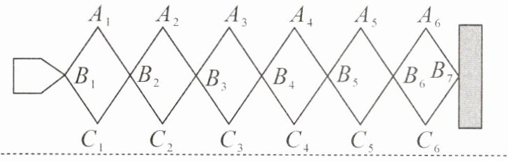 10. (2024·龙岗区期中)如图所示的玩具,其主要部分是由六个全等的菱形组成,菱形的边长为3cm,现将玩具尾部点$B_{7}$固定,当这组菱形的形状发生变化时,玩具的头部$B_{1}$沿射线$B_{7}B_{1}$移动,整个过程中六个菱形始终全等.当$∠A_{1}B_{1}C_{1}$由$120^{\circ}$变为$60^{\circ}$时,点$B_{1}$移动了____