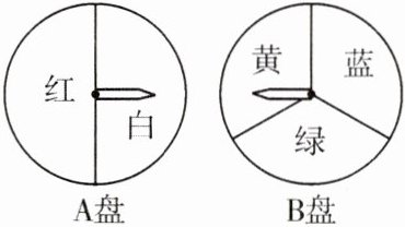 4. [概率与博弈决策](BS 九上 P65)小颖为学校联欢会设计了一个“配紫色”游戏:如图是两个可以自由转动的转盘,每个转盘被分成面积相等的几个扇形.游戏者同时转动两个转盘,如果转盘$A$转出了红色,转盘$B$转出了蓝色,那么他就赢了,因为红色和蓝色在一起配成了紫色.