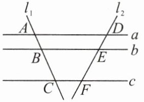 4. 如图,直线$a// b// c$,直线$l_{1}$,$l_{2}$与这三条平行线分别交于点$A$,$B$,$C$和点$D$,$E$,$F$。若$AB:BC=1:2$,$EF=6$,则$DE$的长为____