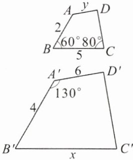 (1)求$\angle A$,$\angle D'$的度数和$x$,$y$的长;$\angle A=$