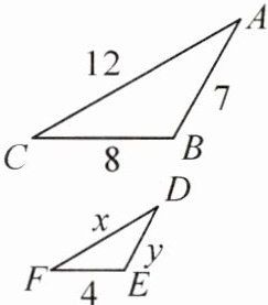 ∴$ \frac{AB}{DE} = \frac{AC}{DF} = \frac{BC}{EF},$即$ \frac{7}{y} = \frac{12}{x} = \frac{8}{4}。$