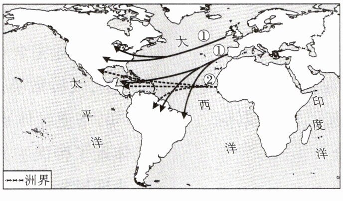(1)①的历史原因:新航路开辟后,欧洲人大量移民美洲地区。(2 分)②的历史原因:在“三角贸易”中,非洲的黑人被大量贩卖到美洲地区充当奴隶。(2 分)