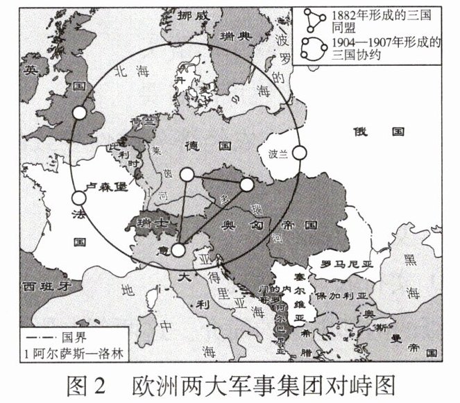 论述:帝国主义各国经济政治发展不平衡,导致帝国主义国家间矛盾重重,最终形成了三国同盟和三国协约两大军事对立集团。两大军事集团展开疯狂的扩军备战,最终导致第一次世界大战爆发。第一次世界大战以同盟国的失败而结束。一战后,《凡尔赛条约》重划德国疆界,阿尔萨斯—洛林归还法国,奥地利、波兰等国独立,德国疆域变小。一战导致奥匈帝国解体,由此产生了许多新兴的民族国家。