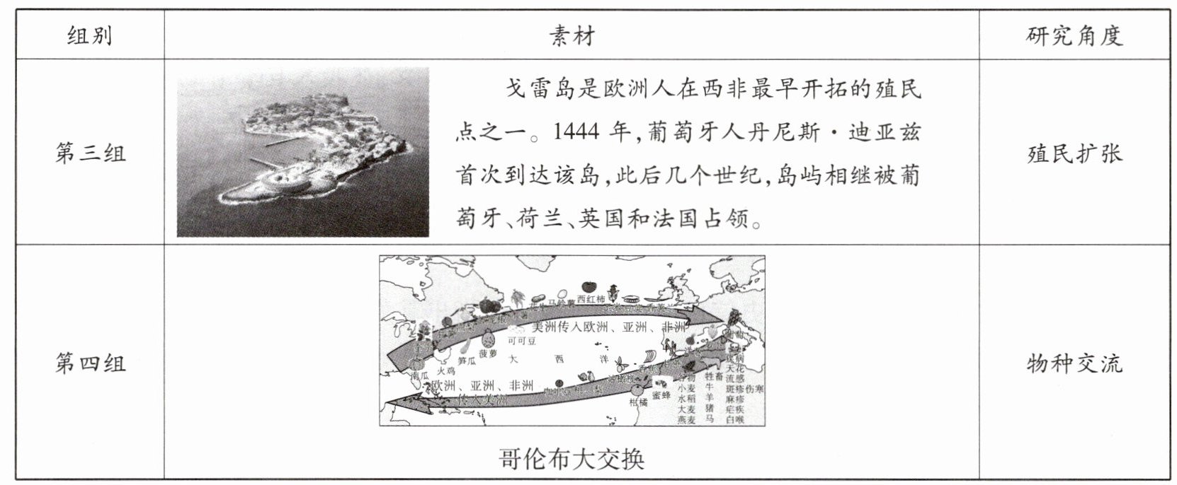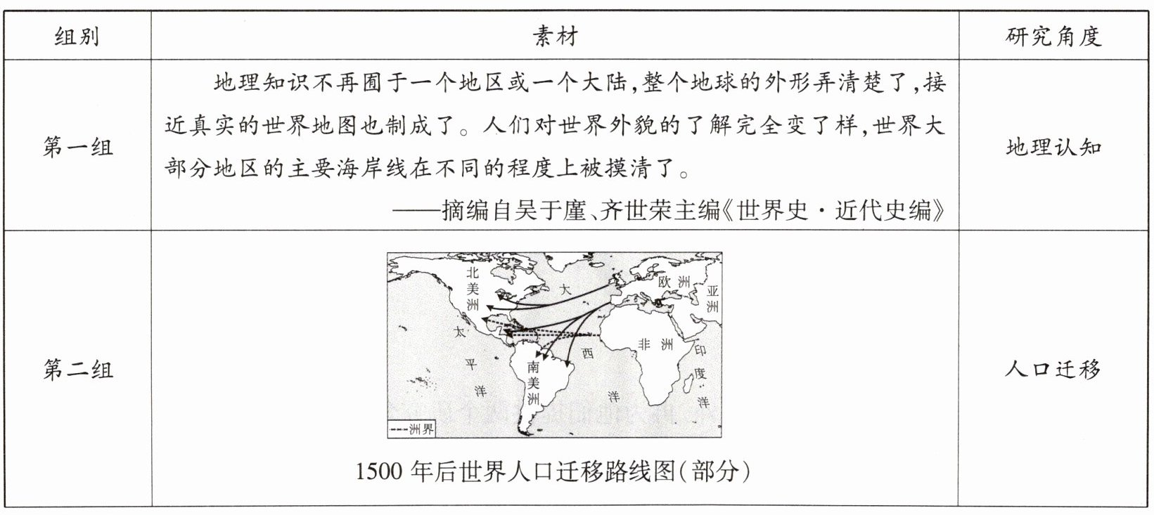【示例一】研究角度:地理认知研究思路:从组内搜集素材看,新航路开辟以后,人们突破了以往的认知局限,对世界地理的认识更加准确。结合相关知识并深入分析可发现,迪亚士的船队到达非洲好望角,达·伽马到达印度西海岸,哥伦布率船队“发现”了美洲,麦哲伦的船队第一次完成了环球航行,证明了地圆说的正确。这些成就都更新了人们对世界地理的认知。研究结论:新航路开辟使人们对世界地理的认知更加深入,世界的观念也从此逐步确立起来。【示例二】研究角度:人口迁移研究思路:从组内搜集素材看,新航路的开辟促进了人口在不同大洲之间流动。结合相关知识并深入分析可发现,为了谋求致富和发展的机遇,大量欧洲人移民至美洲;欧洲殖民者为了获取更大的利润,在非洲掳获黑奴,运往西印度群岛和美洲殖民地,卖给当地的种植园主。这些活动都促进了人口迁移。研究结论:新航路的开辟使人口在不同大洲之间进行迁移,加强了各大洲之间的联系。【示例三】研究角度:物种交流研究思路:从组内搜集素材看,哥伦布“发现”美洲促进了新旧大陆之间的动植物交流,也导致了疾病的传播。结合相关知识并深入分析可发现,新航路开辟密切了世界各地之间的联系,促进了物种交流,推动了当地经济和贸易的发展。同时,人口和动物的全球流动导致了各种疾病的传播,给人类带来了灾难。研究结论:新航路开辟引起物种、疾病在新旧大陆之间传播,对人类社会产生了深远的影响。