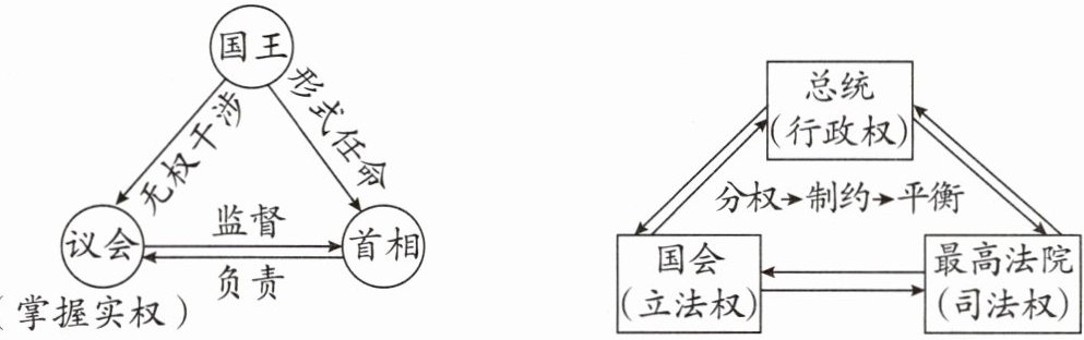 (1)指出材料一中示意图分别反映的民主政治制度,并总结两个国家最高统治者在权力方面的共同点。(4分)