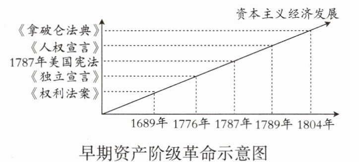 阐释:1689 年,议会通过的《权利法案》限制了国王的权力,此后,英国议会的权力日益超过国王,君主立宪制逐渐形成,为英国资本主义发展提供了政治保障;1787 年美国宪法是世界上第一部资产阶级成文宪法,宪法依据分权制衡原则设计了一个三权分立的联邦制共和国,保证了国家政治长期稳定,为美国经济的发展提供了法律保障;1804 年,拿破仑主持制定的《拿破仑法典》以法律形式巩固了法国大革命的成果,成为很多国家民法的参照蓝本,推动了法国及欧洲资本主义的发展。