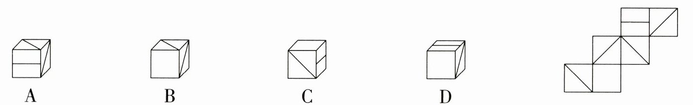B 【解析】将A、B、C、D分别展开,能和原图相对应的即为正确答案。A展开得到图①,不能和原图相对应,A错误;B展开得到图②,能和原图相对,B正确;C展开得到图③,不能和原图相对应,C错误;D展开得到图④,不能和原图相对应,D错误。故选B。