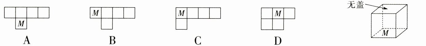 4. (几何体的展开图)如图,有一个无盖的正方体纸盒,下底标有字母"M",将其剪开展成平面图形,想一想,这个平面图形是( )