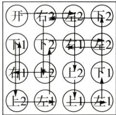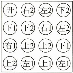 17. (逻辑推理)如图是一把游戏锁,上面有 16 个按钮,游戏规则如下:按照按钮上的提示,按遍全部按钮,才能把锁打开。比如,当你按下第 1 行的第 2 个按钮"右 2"时,就要按照提示,向右移动 2 格按"下 2"钮,再按照提示按"下 1"钮……为了打开这把游戏锁,请你选择第一次应按的按钮,它在第 行的第 个。