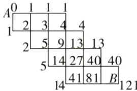 B514274040144181B121【解析】如解图所示,从A点开始,把到达每个路口的路径条数标记出来,每个小正方形右下角的数字等于左下角和右上角两个数字之和,直到求出到达B点所能选择的路线条数。