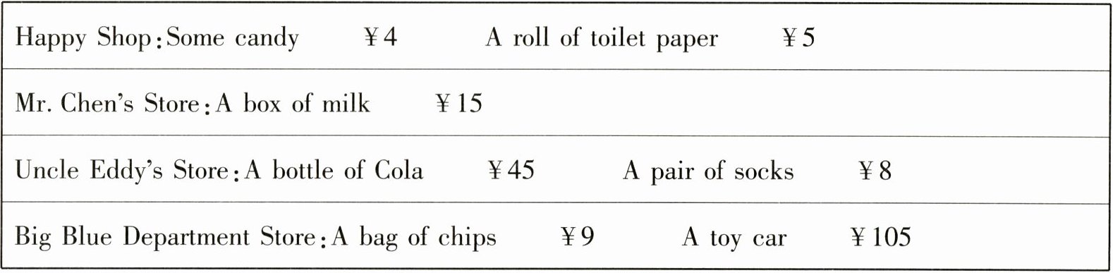 They went to the Happy Shop. They bought some candy. They are 4 yuan. They also bought a roll of toilet paper. It's 5 yuan. They bought a box of milk at Mr. Chen's Store. They bought a bottle of Cola and a pair of socks at Uncle Eddy's Store. They went to the Big Blue Department Store. They bought a bag of chips and a toy car. The toy car is 105 yuan. They were very happy.
