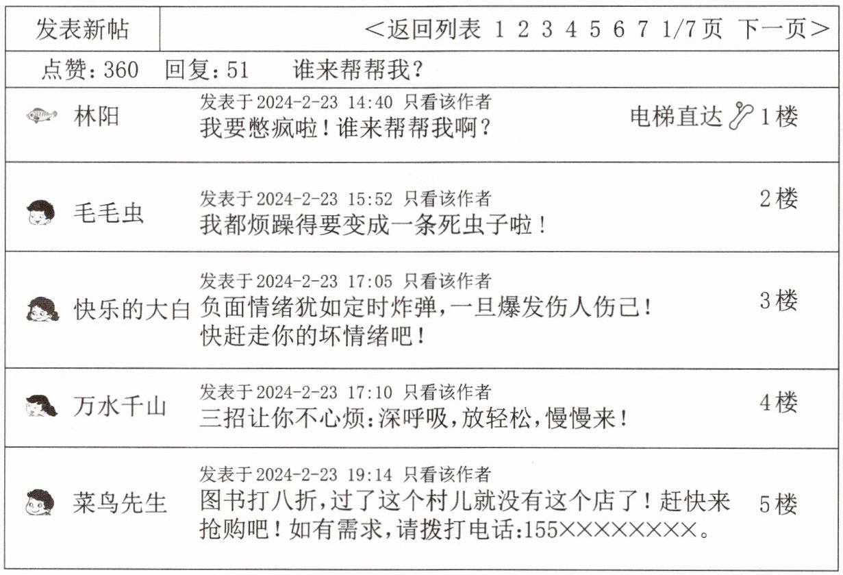 [材料三]2024 年初,林阳同学不慎摔断了腿,被迫在家学习。天天独自一人,还不到半个月,他就憋闷得慌,他在网上发了一条求助信息,很快收到网友跟帖。