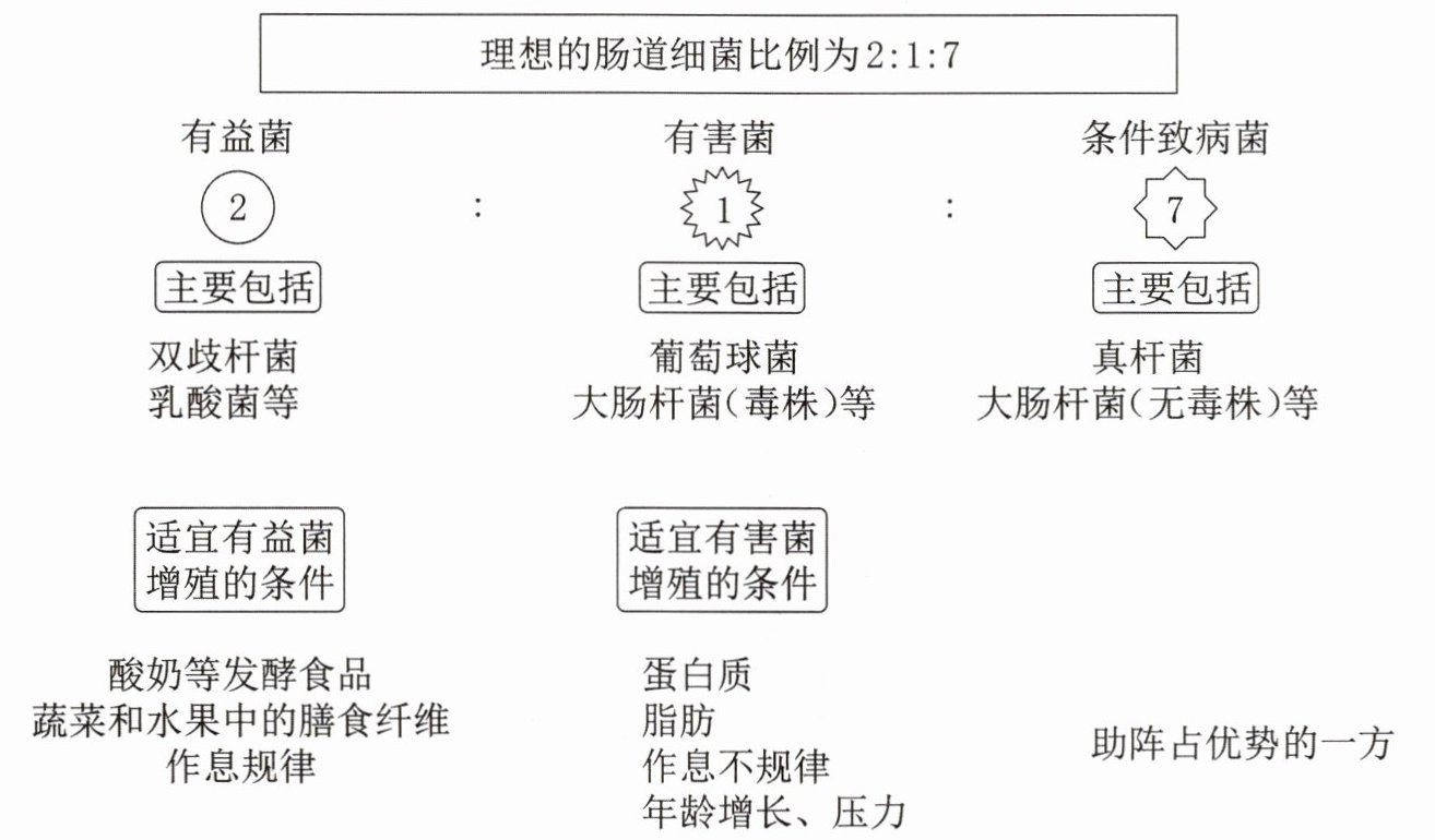 1. D 2. 示例:影响肠道菌群的原因是多方面的。 3. 示例一:材料一运用了列数据、作比较、打比方等说明方法,清晰明了、直观地介绍了目前已知的最大、最小细菌。 示例二:材料二运用图文结合的方式介绍了理想肠道细菌比例,分门别类,清晰有趣。 示例三:材料三运用列数据、举例子等方式介绍细菌和人类的关系,还用了拟人化的手法,表达有趣生动。 4. 示例:小乐,你要注意作息和饮食啊。乱吃零食,作息不规律,给肠道内有害菌增殖提供有利条件,会影响肠道细菌的比例,打破平衡,引发肠道不适。