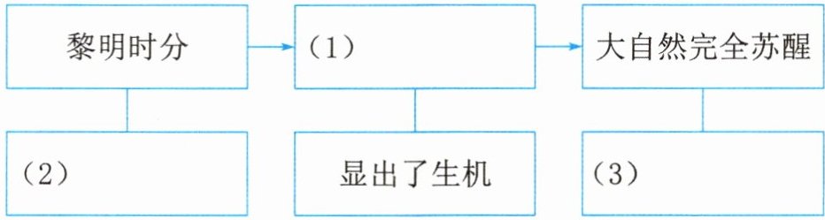 $\begin{matrix}黎明时分 & \to & (1) & \to & 大自然完全苏醒 \\(2) & & 显出了生机 & & (3) \\\end{matrix}\\ $