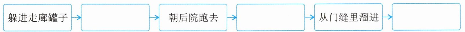 $\begin{matrix}躲进走廊罐子 & \to & ______ & \to & 朝后院跑去 & \to & ______ & \to & 从门缝里溜进 & \to & ______ \\\end{matrix}\\ $
