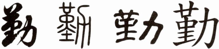 1. (2024·平顶山)中国书法是一门古老的艺术,“甲骨文、金文、篆书、隶书、草书、楷书和行书”被称为书法七体,以下几种字体的“勤”字,分别属于哪一种字体?请你辨认填写。