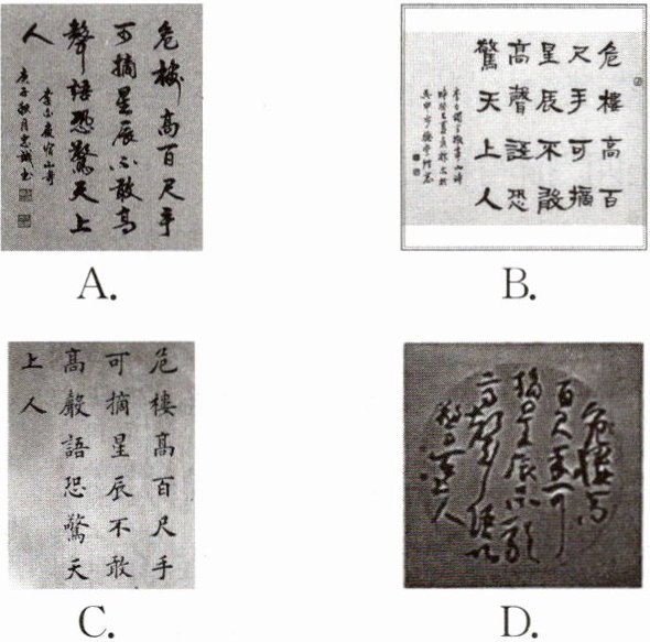 C 【解析】本题考查书法字体的辨识。回锋收笔、笔画雍容大度、含蓄厚重是颜真卿楷书的特点。A项是行书,笔画连绵呼应,字字独立,写得快,也认得清;B项是隶书,方折平直、粗细有致;C项是楷书,形体方正,横平竖直,笔画清楚;D项是草书,笔画相连,潦草难认。