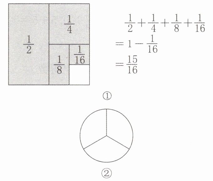 16. (2024·泰州海陵区)我国著名数学家华罗庚先生曾认为数学学习时把数与形联系起来思考,往往会有意想不到的作用。如计算$\frac {1}{2}+\frac {1}{4}+\frac {1}{8}+\frac {1}{16}$时,可以将算式转化成图形面积问题来进行简便计算(如图①)。请你尝试不通分,利用画图的方法简便计算$\frac {1}{3}+\frac {1}{6}+\frac {1}{12}+\frac {1}{24}$。(先在图②中画出示意图,再用简便方法计算,写出计算过程和结果)