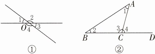 (1)如图①,两条直线相交于点O。小明在推∠1= ∠3时,过程如下,请你写出他每一步推理的依据。