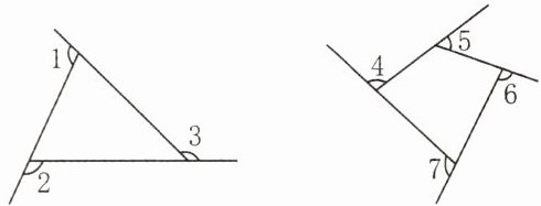 (1)因为三角形的三个内角分别与∠1、∠2、∠3合起来是三个180°,三角形的三个内角的和是180°,所以∠1+∠2+∠3=3×180°-180°=360°。同理,∠4+∠5+∠6+∠7=360°