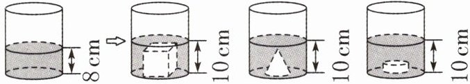 22. (2023·盐城)一个圆柱形容器从里面量,底面积是$240cm^2,$高是20cm,原来水面高是8cm,分别往该容器内浸没不同物体后,水面的高度均上升至10cm(如图)。比较浸没物体的体积,下面说法正确的是(